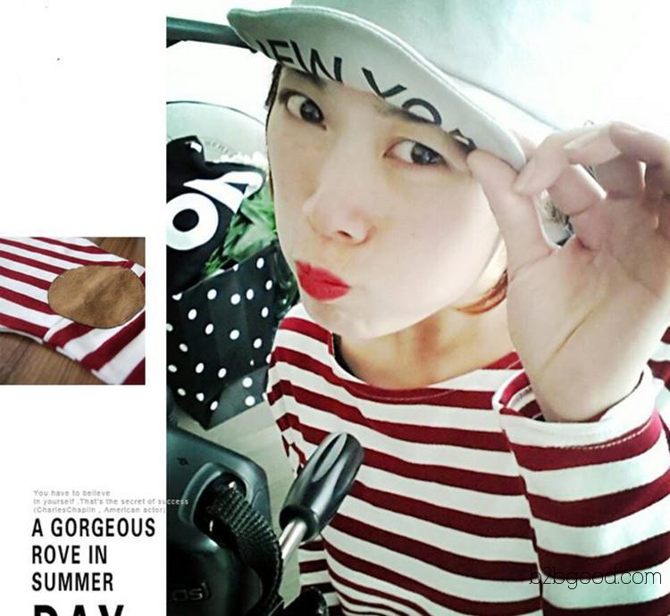 2014春季新款 条纹百搭系 长袖短款补丁打底衫 T恤蝙蝠衫