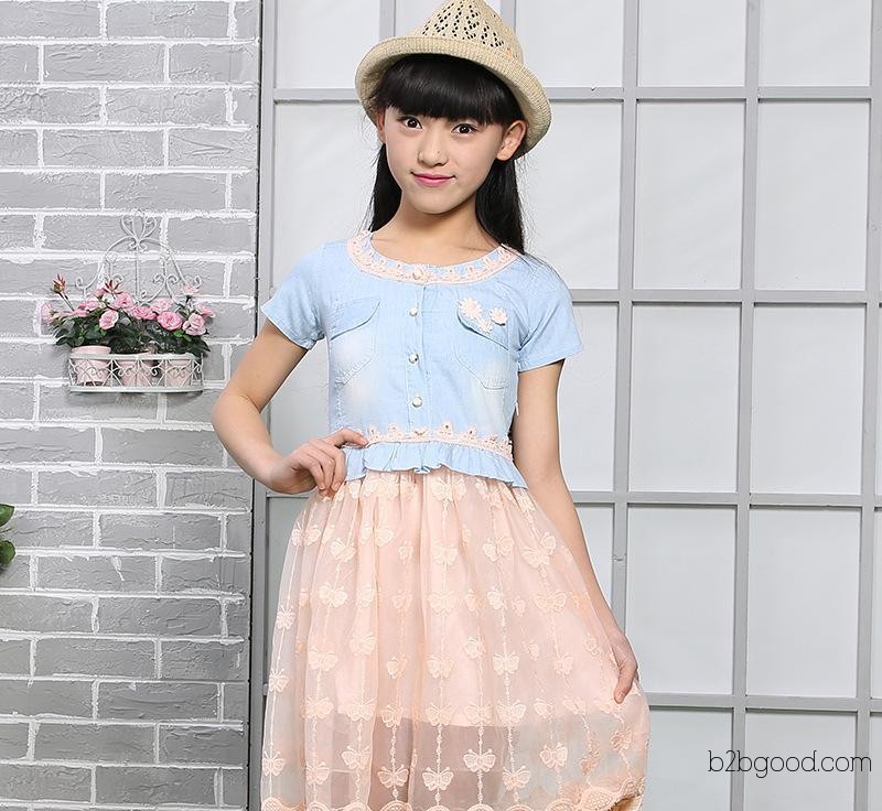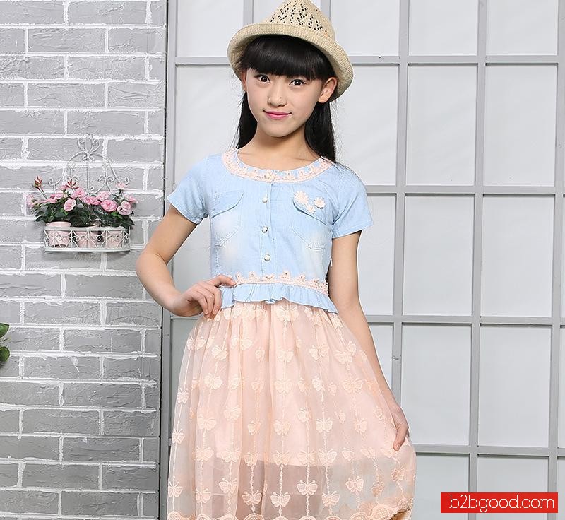 2015韩版夏季新款女童装牛仔短袖拼接蕾丝花边连衣裙公主裙