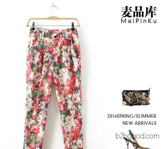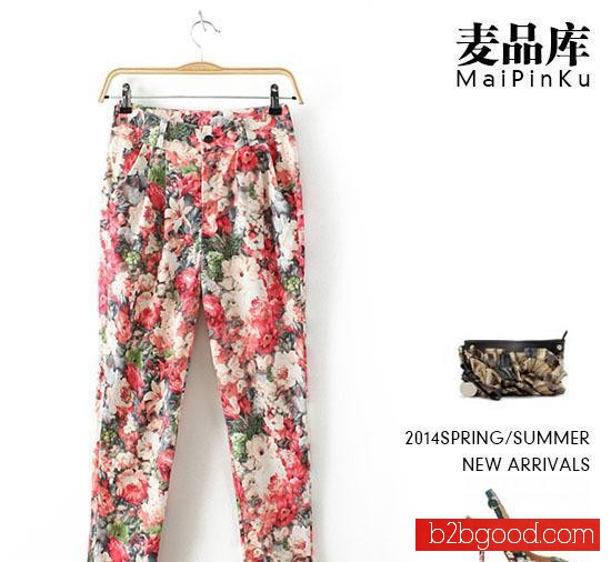 麦品库T7135夏装新款日韩双口袋印花褶皱小脚女式休闲裤