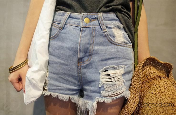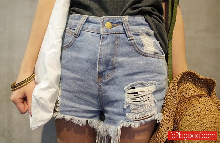 韩国代购 韩版水洗毛边破洞复古高腰牛仔短裤