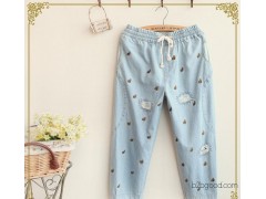 2014新款 森女系 日系 松紧腰系带 刺绣磨破 牛仔七分裤