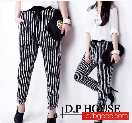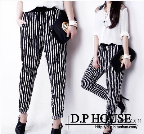 2014新款欧美黑白条纹雪纺休闲哈伦裤