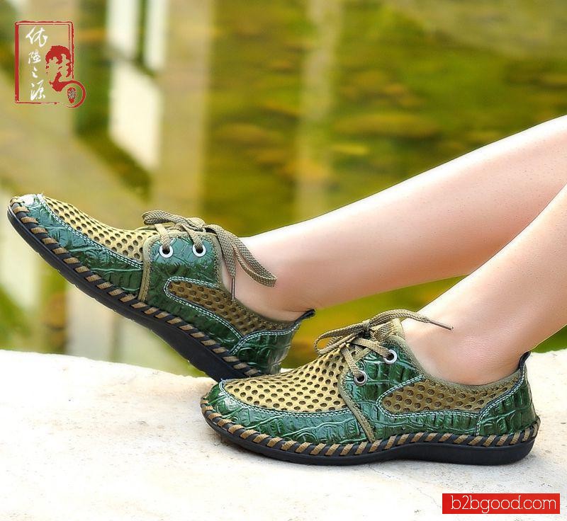 战马军绿色网布鞋 男 透气运动休闲 鳄鱼纹真皮 韩版夏季潮流男鞋