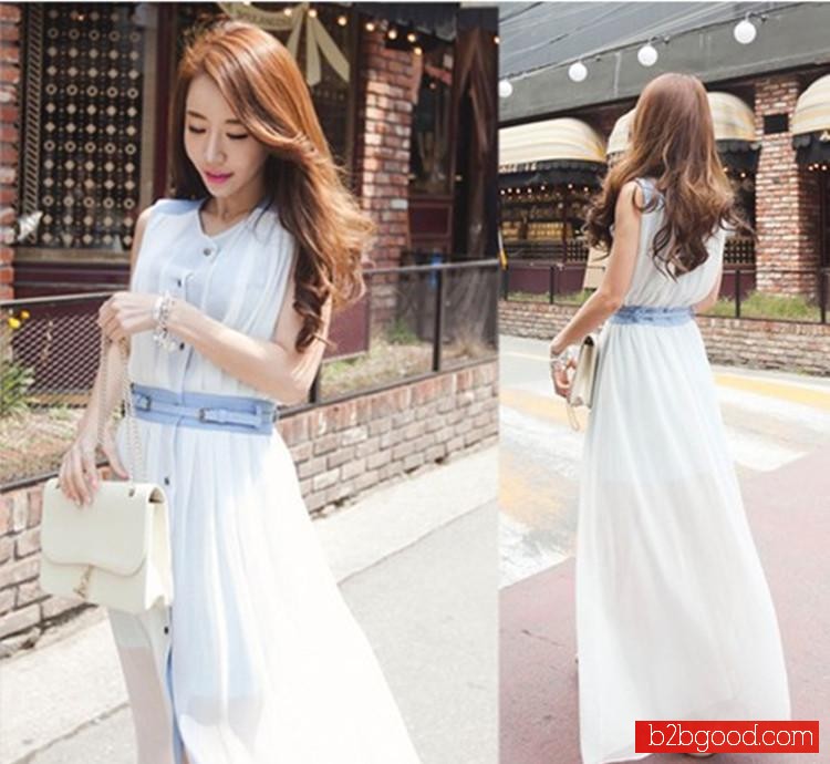 2015夏季韩版无袖圆领连衣裙牛仔拼接雪纺波西米亚长裙