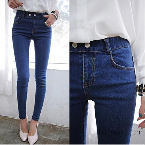 韩国时尚 显瘦修身中腰两粒扣铅笔裤小脚牛仔裤女