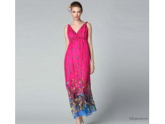 2014茧蝶波西米亚长裙V领露背绑带收腰印花真丝雪纺连衣裙B